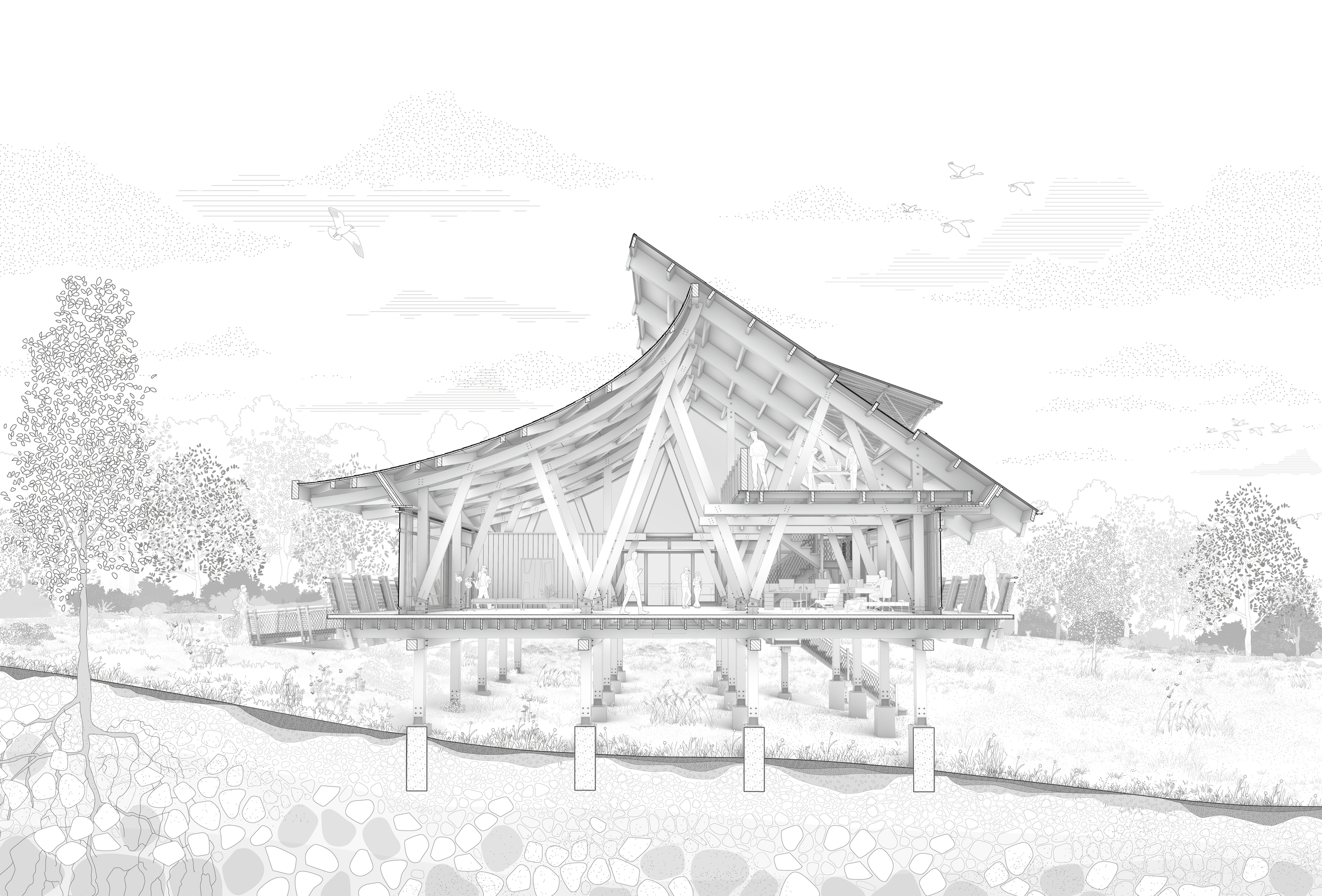 The design originated from this single sketch, exploring the idea of a timber construction elevated from the ground on exposed concrete foundations. From there, I refined and developed the design of the building to respond to the sloping terrain, with one side of the roof curving gently into the hillside landscape.